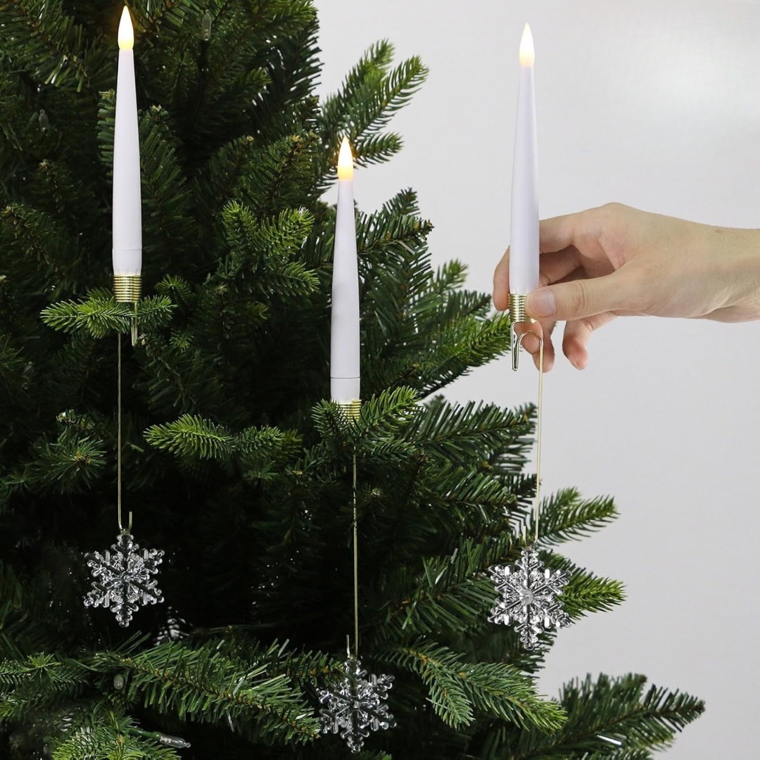 Ogni candela può essere facilmente fissata grazie ai ganci dorati inclusi. Il pratico telecomando ti permette di accenderle e spegnerle o impostare il timer di 6 ore per un funzionamento automatico, garantendo il massimo della comodità durante tutte le festività.