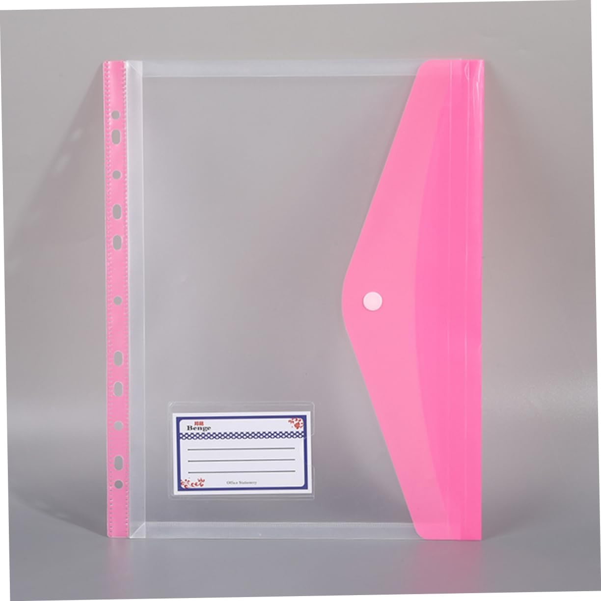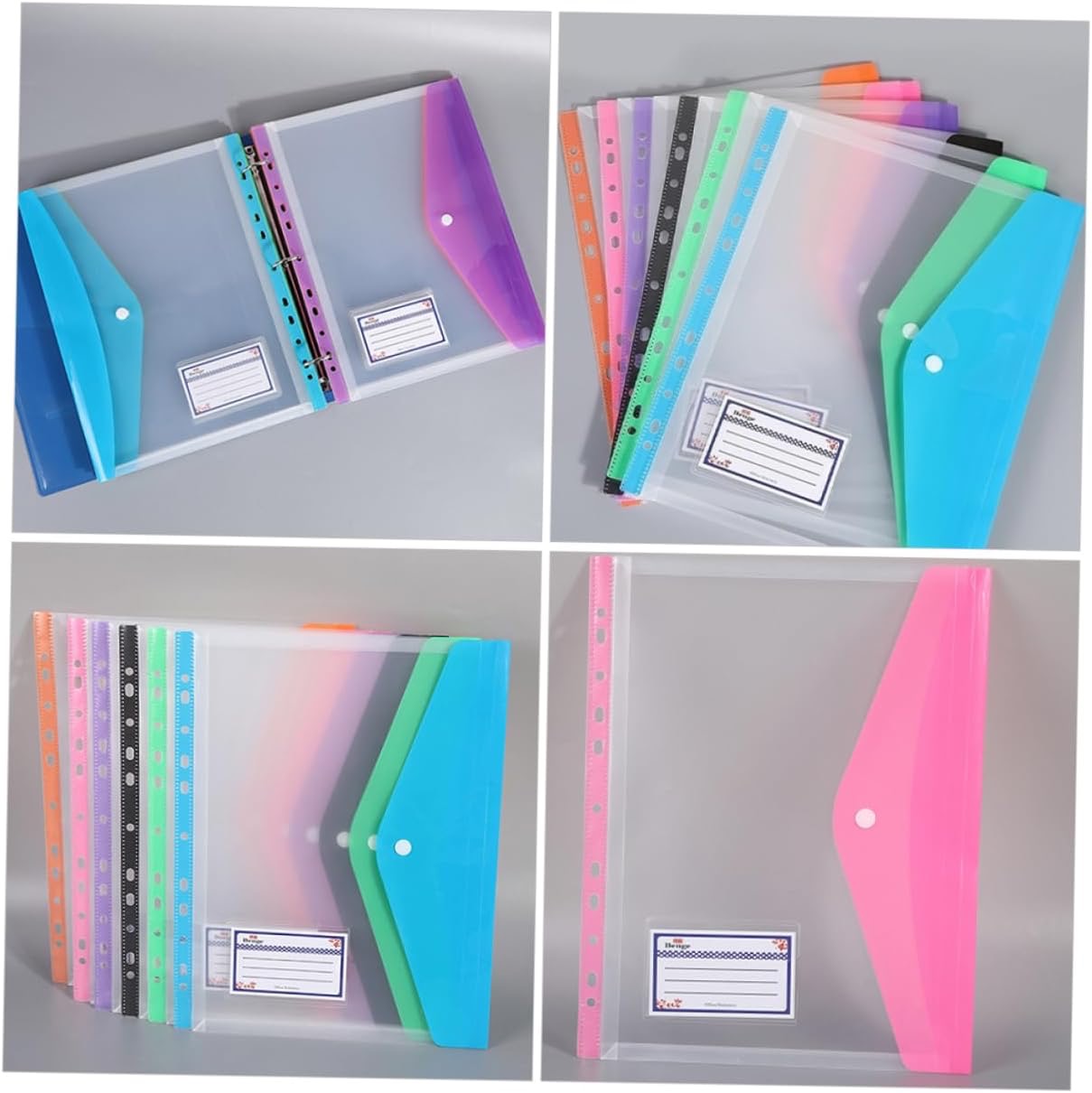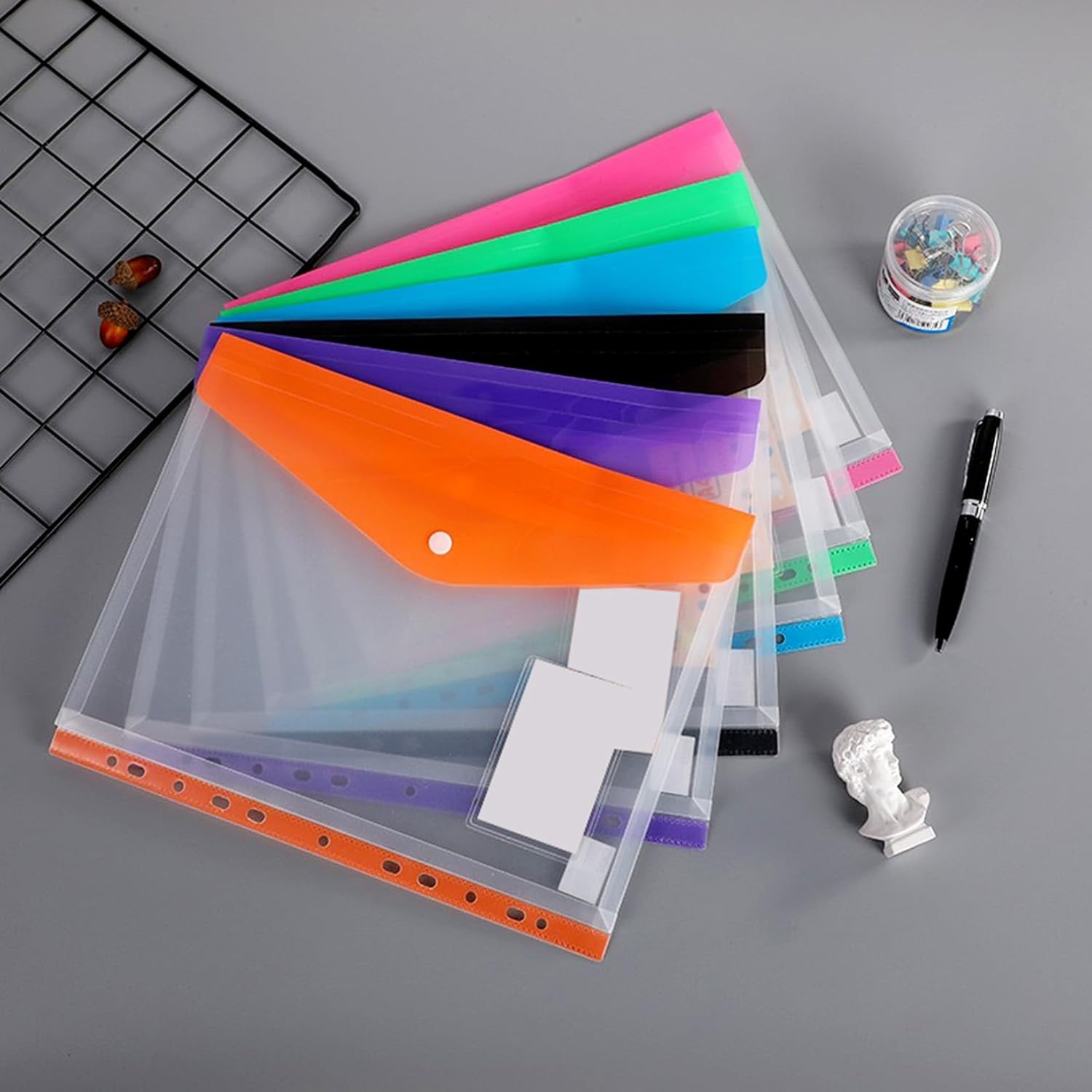 Grazie al materiale trasparente, vedi subito cosa c’è all’interno senza dover aprire. La chiusura con bottone tiene i tuoi documenti al sicuro, mentre sei colori vivaci rendono l’organizzazione ancora più semplice.