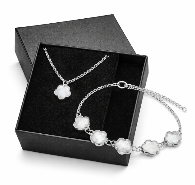 Il set include una delicata collana e un bracciale coordinato, che puoi indossare insieme oppure separatamente. Il design raffinato risalta con ogni outfit e dona un’eleganza senza tempo.