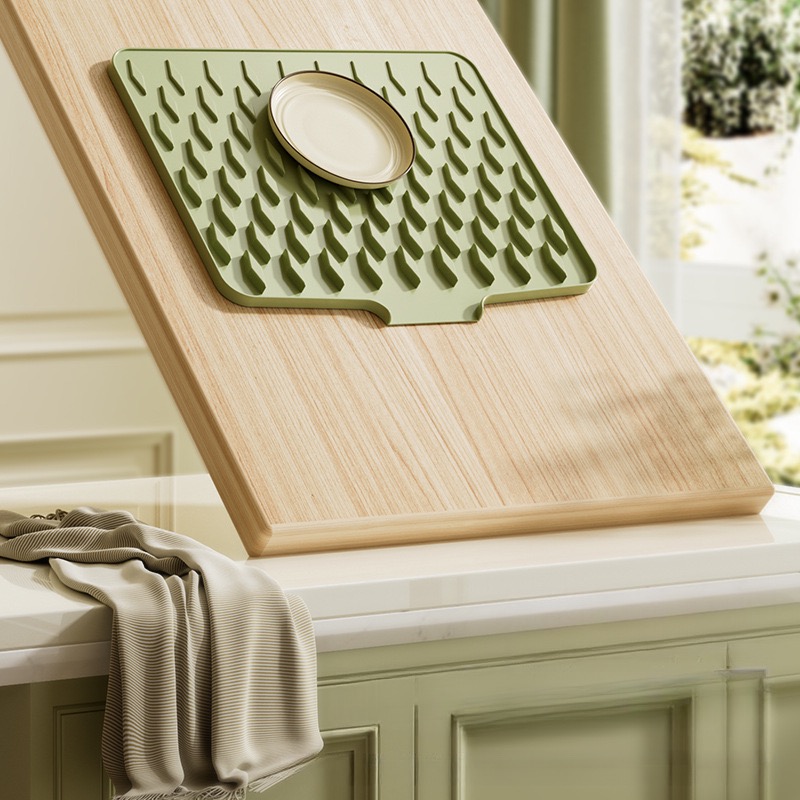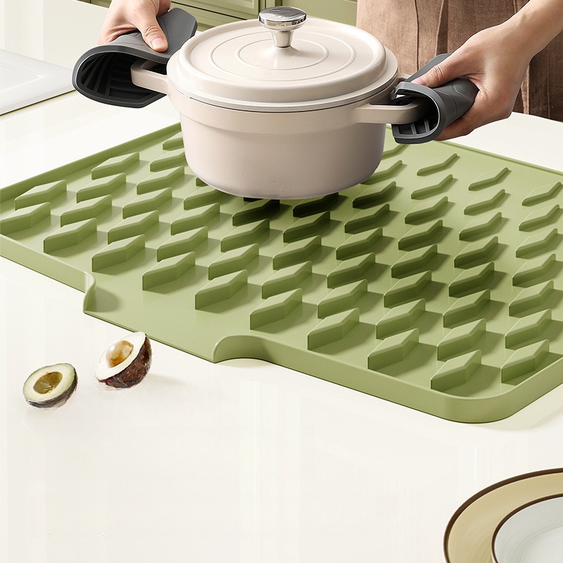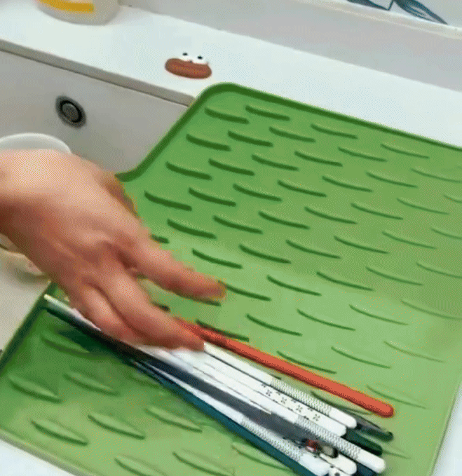 Questo flessibile tappetino in silicone 2-in-1 mantiene la tua cucina asciutta, pulita e protetta — funziona sia come tappetino ad asciugatura rapida per le stoviglie che come sottopentola resistente al calore. Grazie alle strisce rialzate per la ventilazione e al silicone durevole per uso alimentare, garantisce asciugatura veloce, pulizia semplice e un utilizzo quotidiano duraturo.