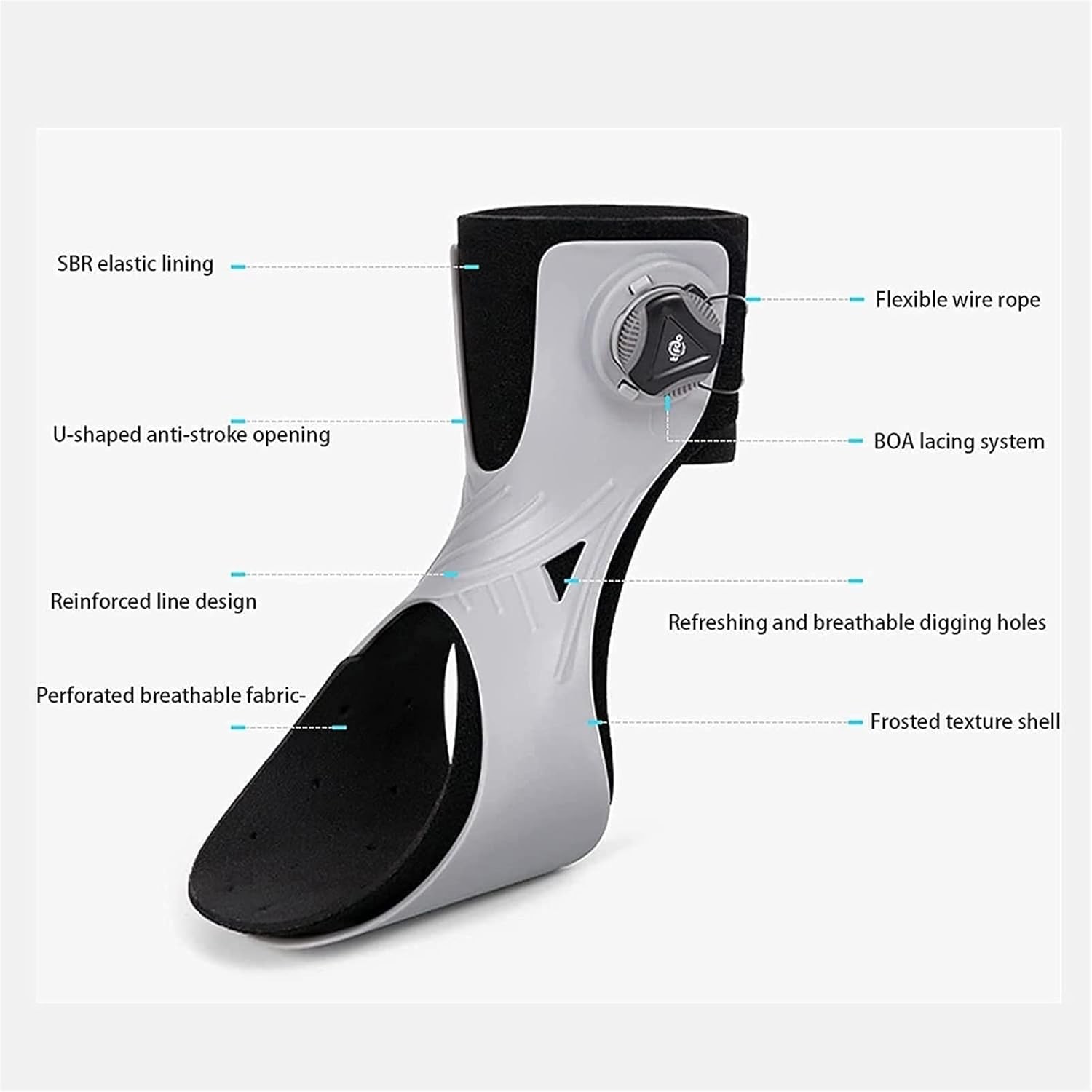 La struttura bassa e arcuata e il tallone aperto permettono al tutore di adattarsi comodamente alla maggior parte dei tipi di calzature. È realizzato in resistente polipropilene con suola semirigida e combina robustezza, flessibilità e comfort duraturo senza limitare le attività quotidiane.